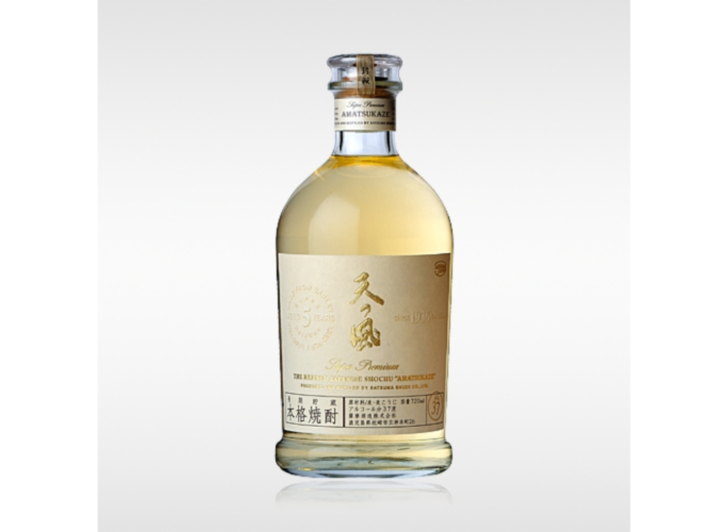 〈神の河〉や〈さつま白波〉でおなじみの薩摩酒造がつくる樽熟麦焼酎〈天つ風(あまつかぜ)〉。角のない柔らかなかたちのボトルは、まるでヴィンテージの洋酒のよう。ラベルの上品さと琥珀色の酒質も相まって、高級感のあるデザインに仕上がっています。