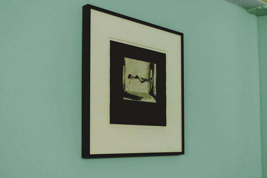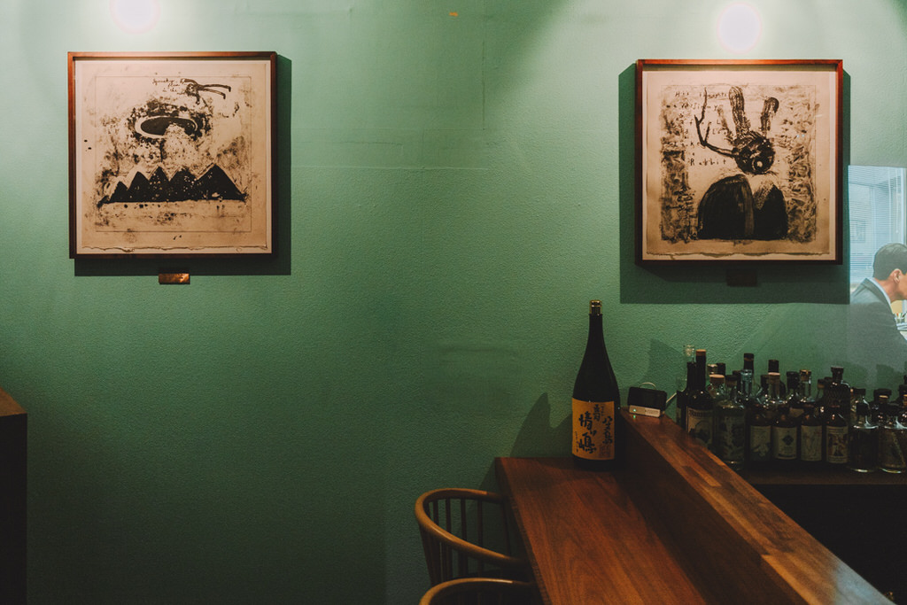 「この緑色の壁は、リンチの短編映画、『Rabbits』がモチーフ。3匹のヒューマノイド・ラビットが、ペール・グリーンの壁に囲まれた一室で噛み合わない会話を永遠と続ける作品です。映画ではもっとダークなのですが、あの鬱屈とした雰囲気へのオマージュでグリーンにしました。壁にかけている3つの作品はリンチの作。カウンター側の2つは版画、扉の横にあるのは写真を版画に落として刷った作品です。“リンチの世界感に浸れるバー”を謳っているので、海外のリンチファンが来られることもあるんです」