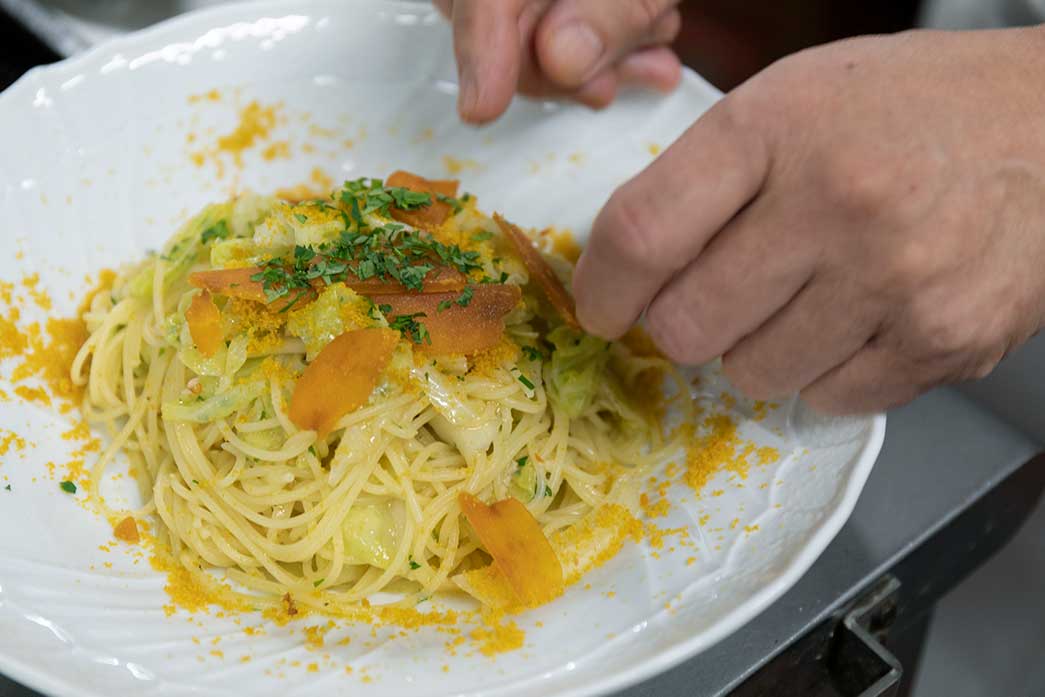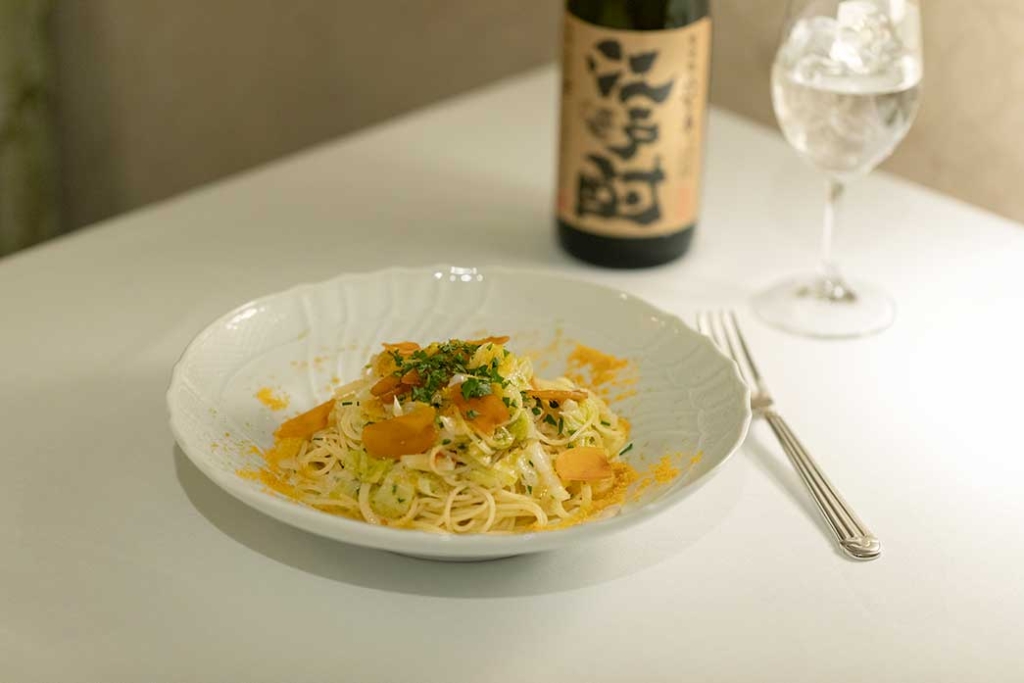 芋の熟成焼酎と「キャベツとからすみのパスタ」|片岡護シェフのイタリアン&熟成焼酎ペアリング #01