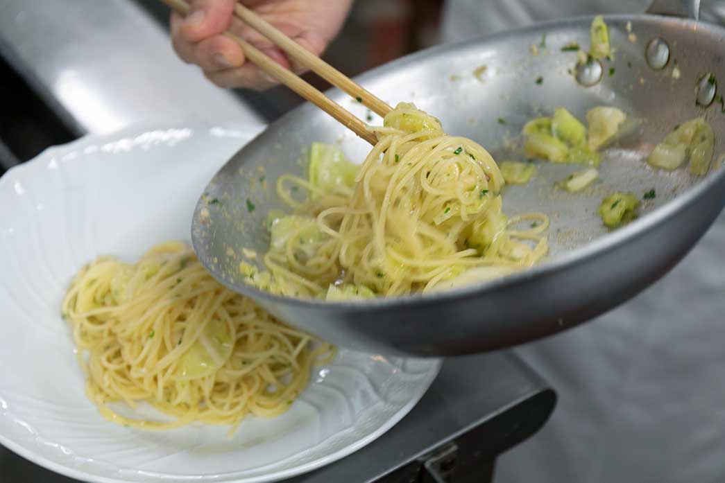 材料を揃えてから10分足らずで完成するシンプルメニュー。「味が絡みやすい、細めのパスタがいいよ」と片岡さん。