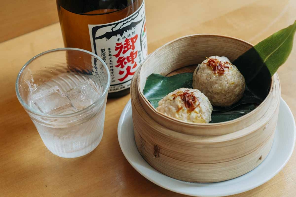 次に出てきたのは、「むちむち肉団子の沖縄月桃の葉蒸し」。豚ひき肉に椎茸とたけのこを加えてつくった肉団子を、爽やかでほんのりあまい香りのする月桃の葉とともに蒸した一品です。合わせるのは、東京都大島にある谷口酒造がつくる麦焼酎〈御神火〉。クセの少ないまろやかな口あたりながら、麦の香ばしい香りもしっかりと感じる味わいが、パンチのある肉団子を包み込むようです!