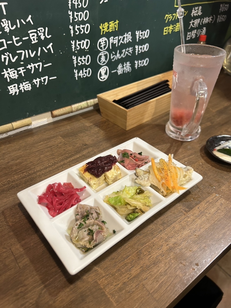 目の前の大皿料理が売りの『小鳥遊』とは異なり、『日日夜夜』ではプレートに盛られたオードブルが、独り呑みサイズで提供される。西荻窪は”和”、阿佐ヶ谷は”洋”といった使い分けも楽しそうだ。