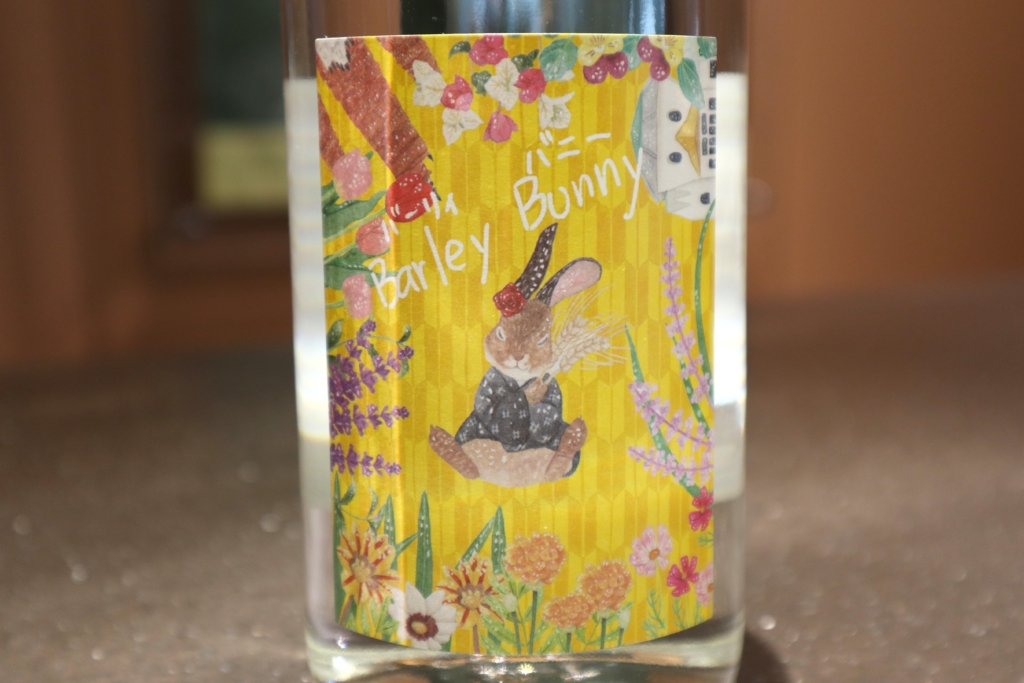 ラベルはバナナをイメージした黄色がベース。ニホンノウサギが原料にも使用されている二条麦を抱きしめて風を感じています。さらにバラの耳飾り、久留米菱模様の着物を着ているのがこだわりです。