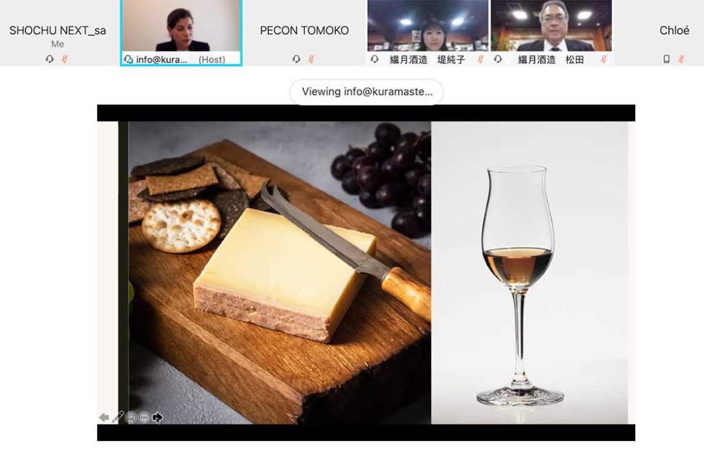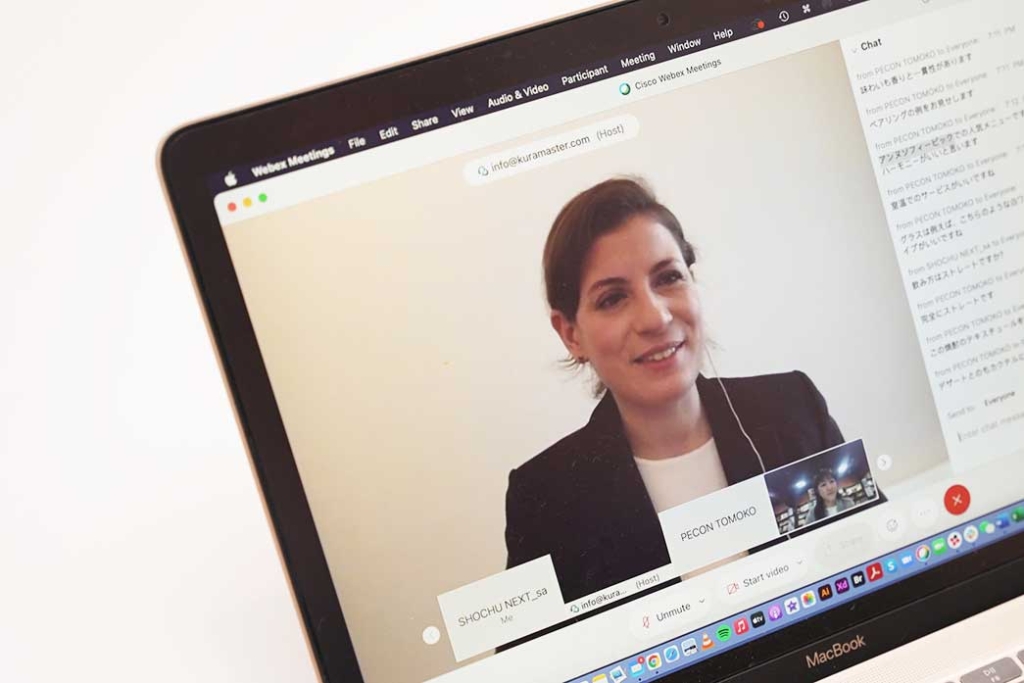2月15日に開催されたのは、熊本県人吉市の「繊月酒造」のオンライン蔵見学と、オーク樽熟成の〈焔の刻印〉の試飲会。同社社長の堤純子さんによるプレゼンテーションや、フランスの飲食文化に見識の深いKura Masterによる試飲コメントなどにバイヤーやソムリエたちが聞き入った。