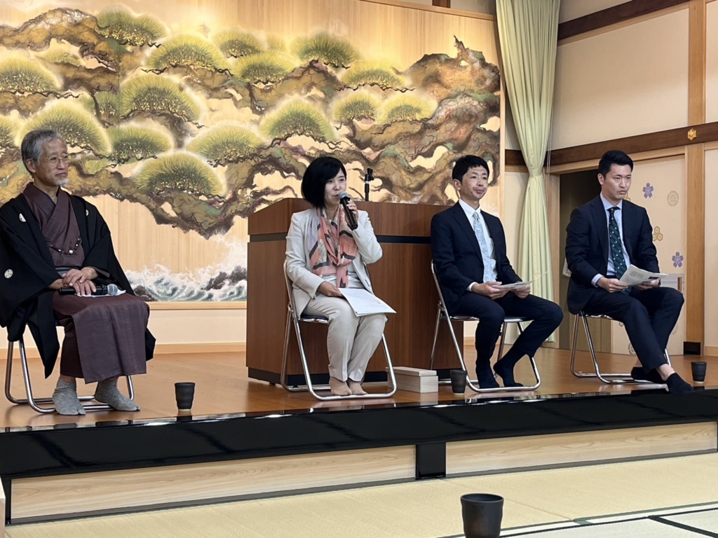 今回は焼酎の普及に努める方々と蔵元との相互交流の機会も兼ねていました。直会に入ってすぐ、焼酎を広める活動をしている方々の活動報告が行われました。今回ゲストで来られていたのはHarmoniK代表 黒瀬暢子さん、YAKUSAKE 春田貴博さん、SHOCHU X代表 橋本啓亮さんです。なぜ自分たちが焼酎について発信しているのか、現在の取り組み、そして今後について、資料や商品を持ち熱心に話されていました。