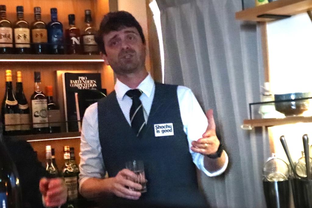 まずはSHOCHU NEXTでもお馴染み、クリストファー・ペレグリニ氏による焼酎セミナー&カクテルに使用されている焼酎のテイスティングセッションが行われました。在日23年のクリストファー・ペレグリニ氏は日本語も堪能!自らを「焼酎と泡盛のオタクです」と名乗り、世界各地で開催している焼酎セミナーの一部を再現。