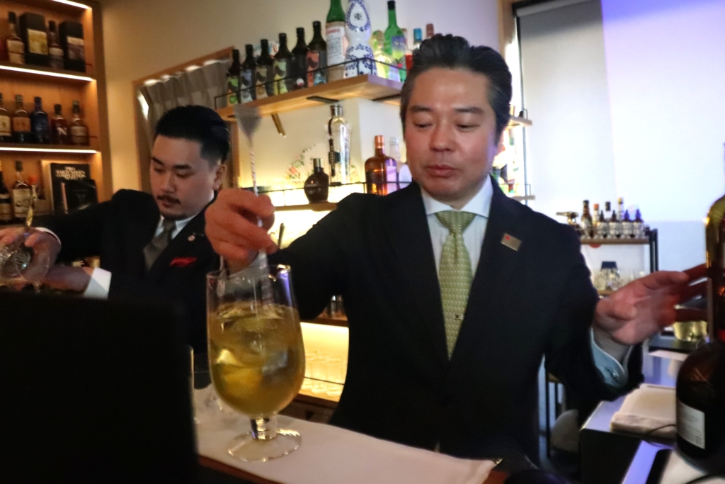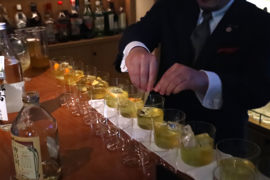 続いては遠藤真彦氏により3月1日から「Mizunara: In Tokyo」で提供される焼酎カクテルのひとつで、黒白波を使用した「出汁ネグローニ」がふるまわれました。遠藤氏は、2008年サントリーカクテルチャンピオンで、香港にジャパニーズスタイルを伝えたバーテンダーです。