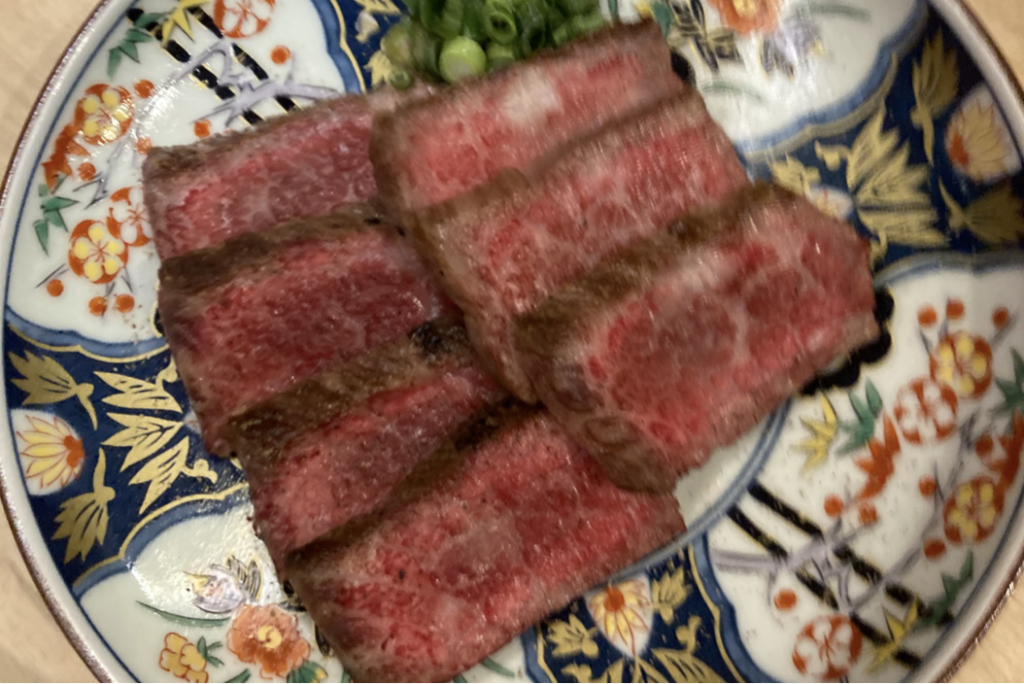 吉村氏の生まれ故郷、壱岐島の「壱岐牛のステーキ」(参考品)。年間800頭しか流通しないと言う幻の牛だそう。甘味のある脂と赤身とのバランスが絶妙で旨かった。