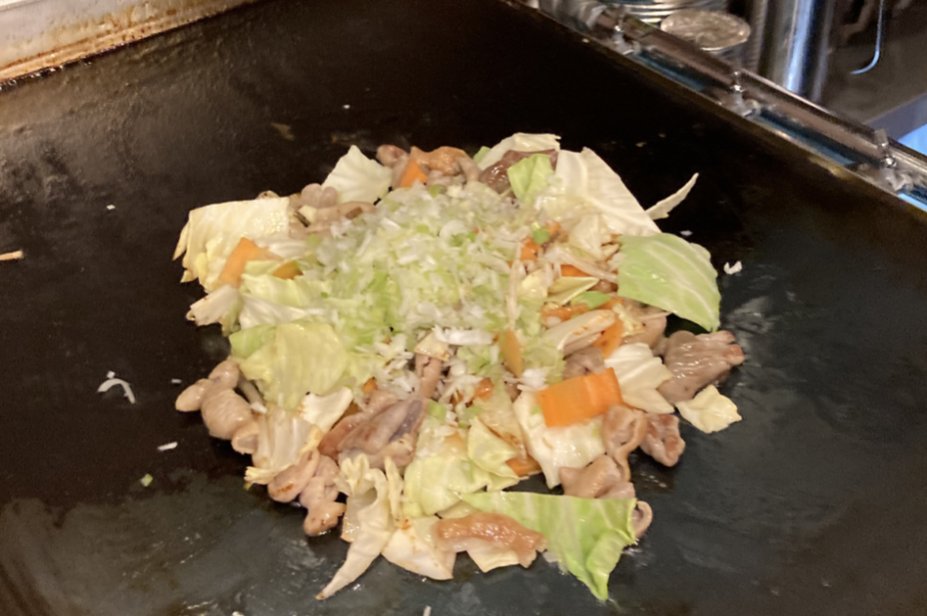 メニューに”名物”と銘打った鉄板豚もつ「ねぎ塩にんにく炒め」(780円)。カウンター脇の小さな鉄板で、もつと野菜をにんにくを効かせ、塩で炒めた逸品。この塩ベースとは他に、甘味と辛味をミックスした醤油ベースも用意されている。