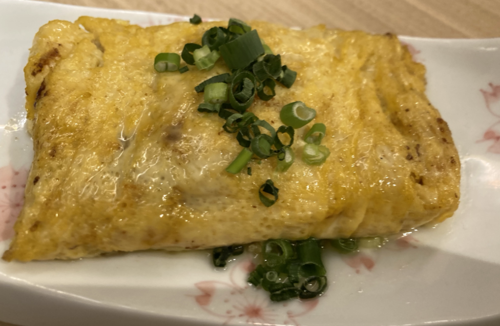 これまた鉄板で焼き上げる「出汁巻き玉子」(880円)。ふっくらしつつも出汁のパンチの効いた仕上げで、熱々の内にいただいて欲しい。