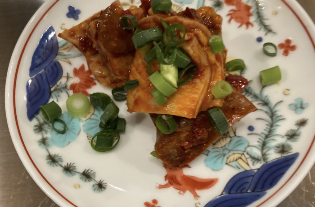 まずは、冷菜の「ガツ豆板醤」(680円*税込・以下同)から。弾力のあるガツと豆板醤、ねぎとの相性が抜群で最初の一杯のアテに最適だ。