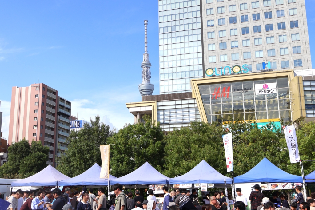 「すみだストリートジャズフェスティバル」であちこちでジャズの生演奏が行われていた錦糸町駅前。駅からすぐの錦糸公園ふれあい広場では「すみだワンコインオクトーバーフェスト」も開催され、多くのお酒好きな方でにぎわっていました。