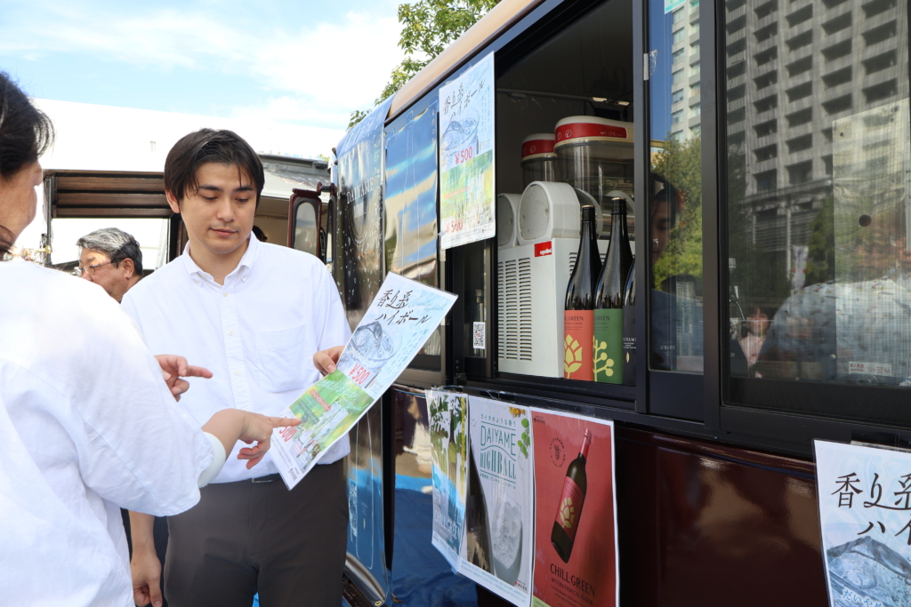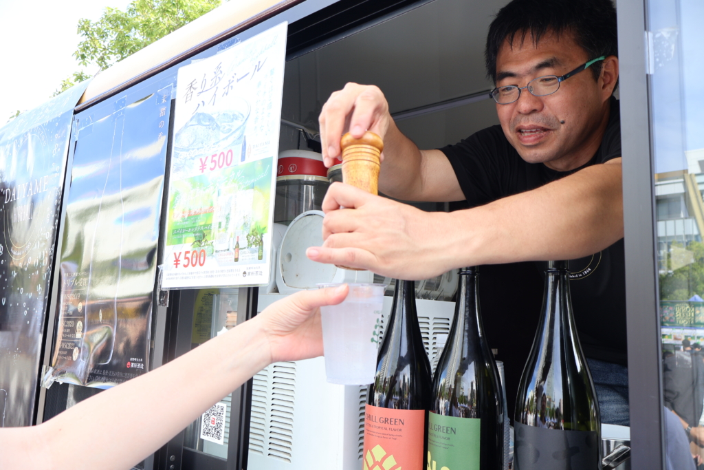 安江さん、谷本さんも自らキッチンカー内でお酒をつくり、お客さんへの接客を行っていました。偶然飲食店経営をしている方が訪れ、味に感動し「うちの店でも『CHILL GREEN』を取り扱います!」と言ってくれる出会いもあったといいます。