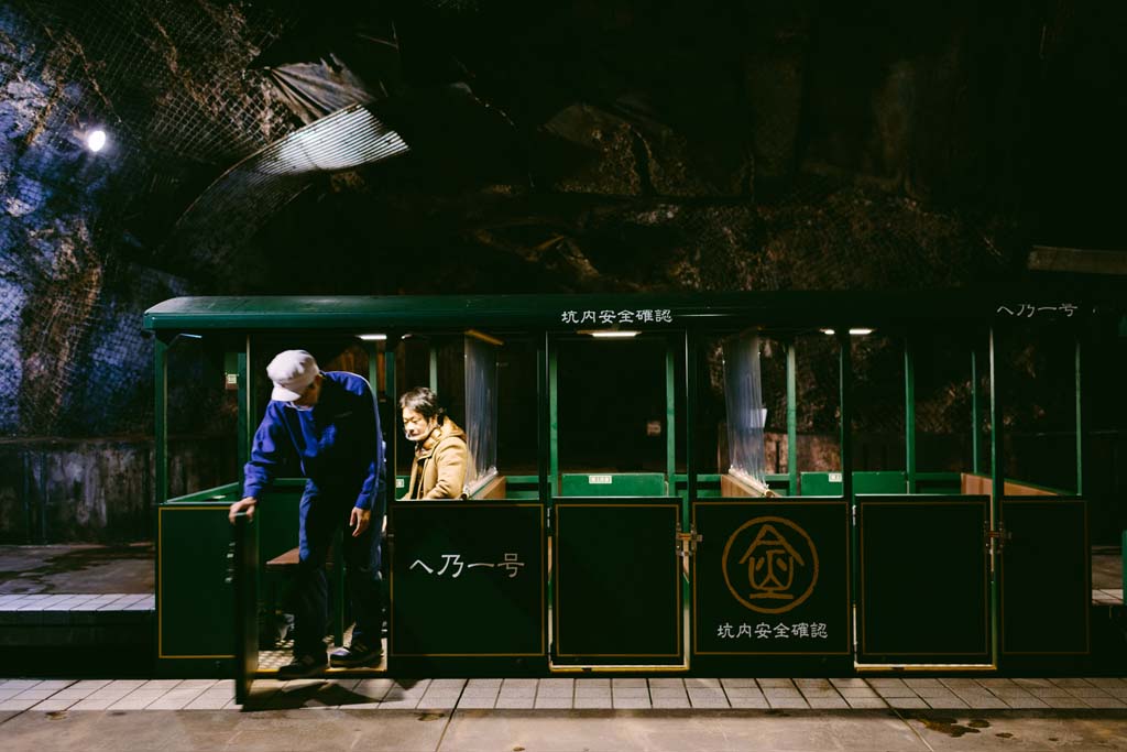 かつて金が採掘された「金山蔵」。今は丁寧なつくりと熟成を経た宝のような焼酎を生み出しているというのは大げさすぎるだろうか? いい酒も、人々の暮らしを豊かにするからなあ……! そんなことを思いながら一行はまたトロッコに乗り込み、地上へと向かった。