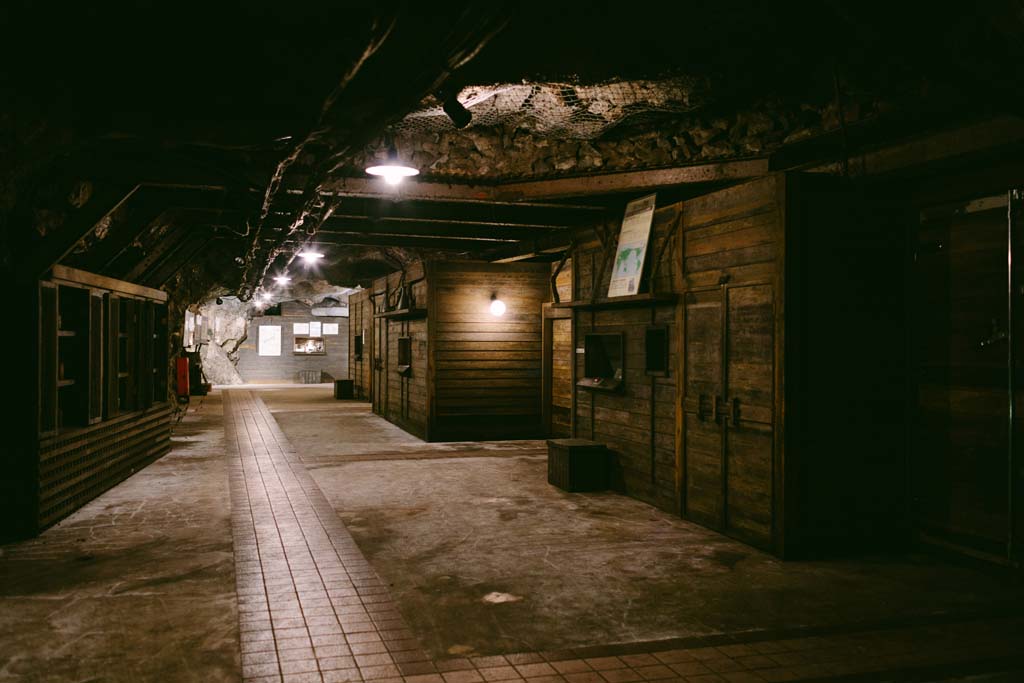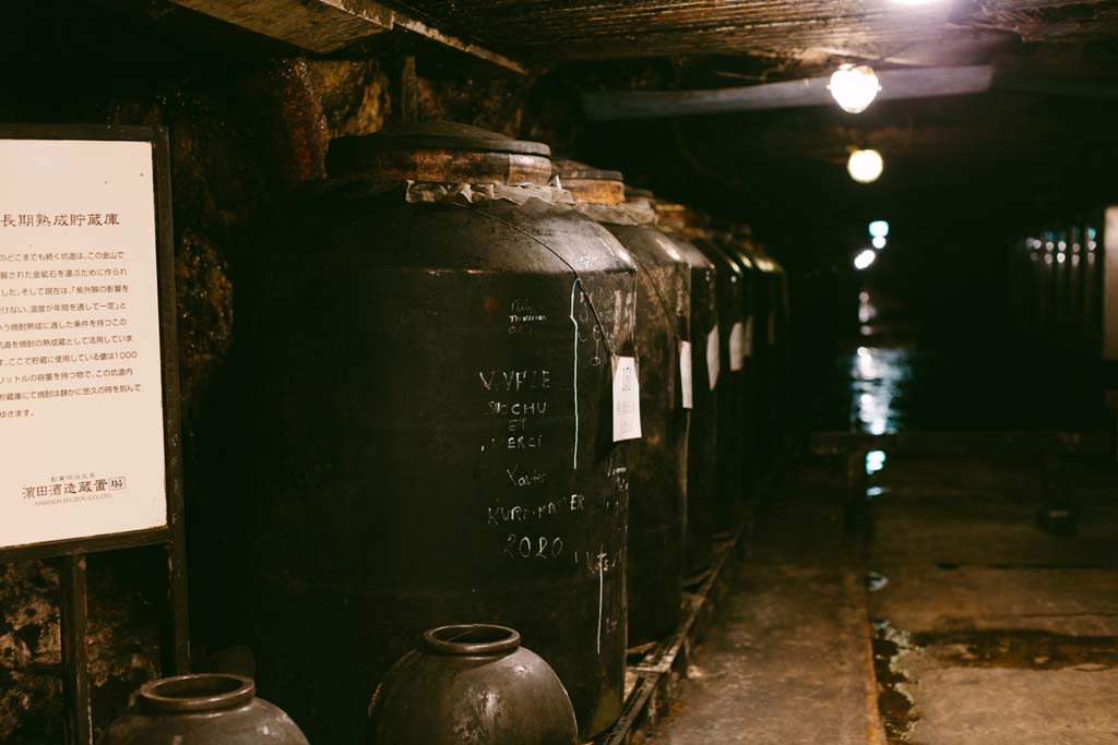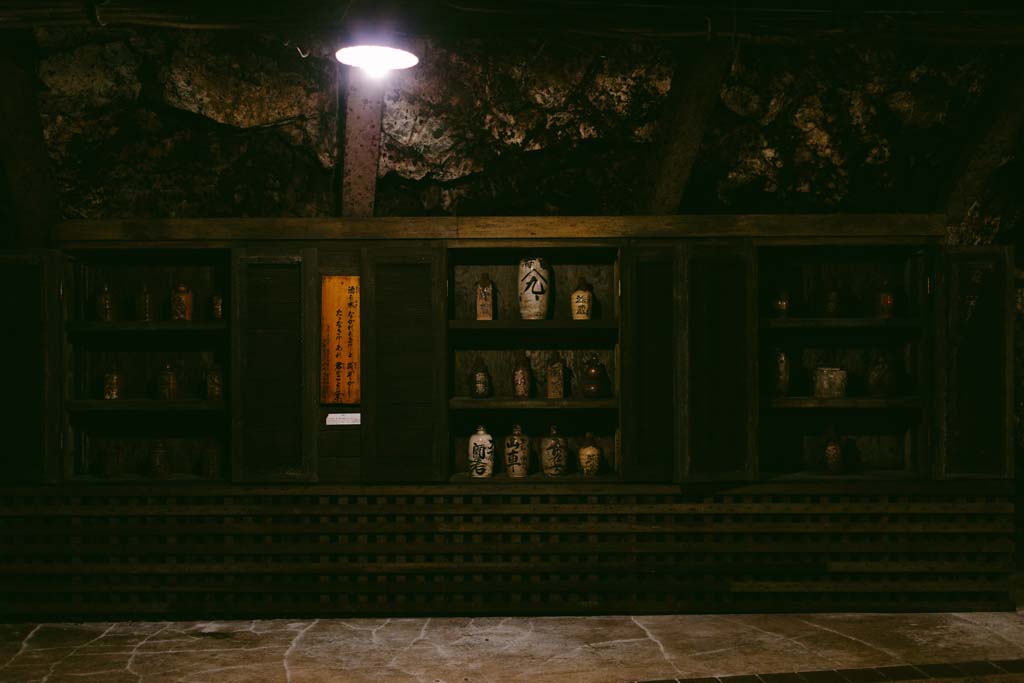 350年以上の時をかけて掘り進められた坑洞は、総延長なんと120km。蟻の巣のように張り巡らされた道沿いに、現在は、焼酎をたっぷりとたたえた巨大な甕が遠くまで並んでいる。
