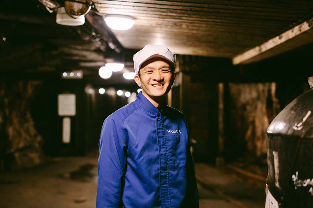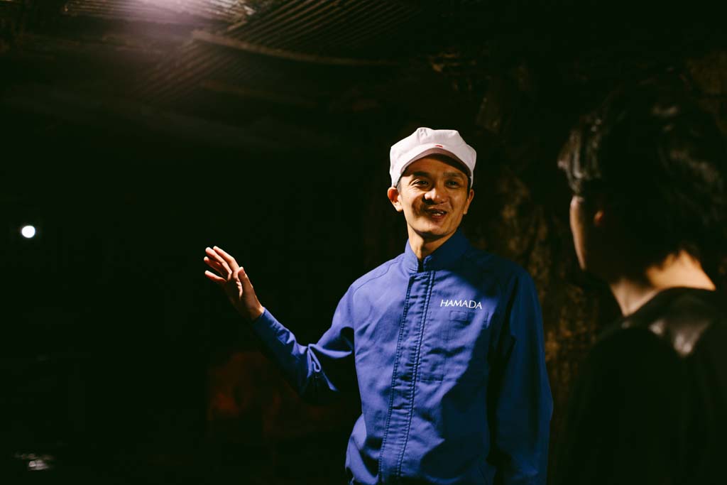 岩盤の中を抜けていくトロッコを降りると、外気とは全く違った、しっとりとした空気に包まれる。この薩摩金山蔵で杜氏を務める東條健太さんが話す。
