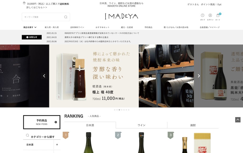 IMADEYA SUMIDAなど、首都圏で酒販店を展開する株式会社いまでやは、通販サイトも抜群の充実ぶり! 全国各地の焼酎が500種類以上揃い、まさにお酒のオンラインデパート。よりすぐりのおつまみやグラスもあって、ついつい”ウィンドウ”ショッピングが長くなってしまう! サイトのデザインもシンプルで見やすいし、価格や蔵元で商品を絞り込めたりと、とにかく使いやすいのも魅力。ギフト用のラッピングもおしゃれなので、贈り物探しにもぴったり。何かいい焼酎ないかな〜と思ったらひとまずここ! とおすすめしたいサイトです。