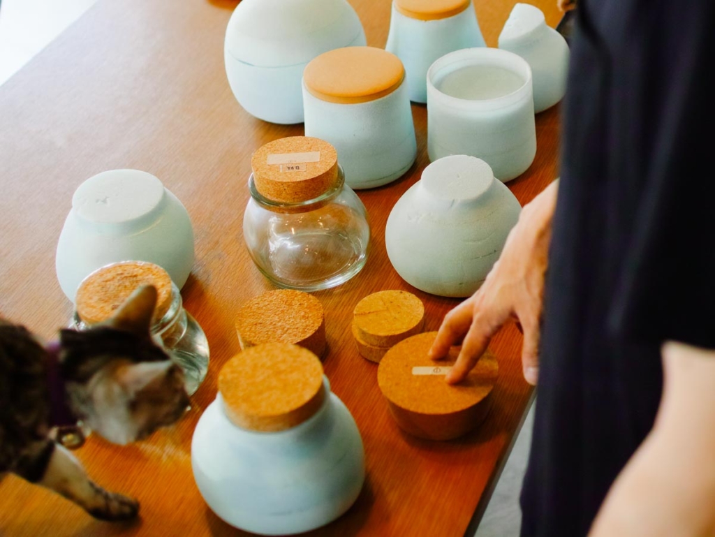 「〈甕雫〉と同様、〈京屋 雫ル〉も柄杓で汲むことが決まっていました。だから当然、柄杓が入る大きさの開口部が必要ですが、何より大事にしたのがその開口部を閉じる蓋です。運搬中に漏れないようしっかり密閉する必要がある一方で、力を入れなくても簡単に開くものがいい。矛盾する要素を一度に解決しないとならないんです。しっかり栓ができるコルクを使うか、簡単に開けられるヨーグルトのようなシール蓋にするか……。口が広いこともあり、蓋の素材選びからかなりの時間を費やしました。コルクにすることが決まってからも、機能性を確かなものにするために試作を重ねました。