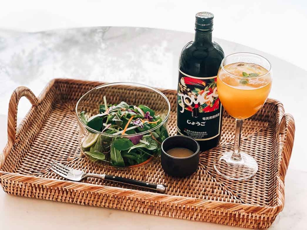 マンゴージュース割りがトロリと甘めなので、黒糖生姜ドレッシングをかけたグリーンサラダで。ドレッシングと焼酎の黒糖がリンクして、ぐっと相性がよくなります。南国生まれの食材からたくさんパワーをもらって1週間がんばるぞ~♪