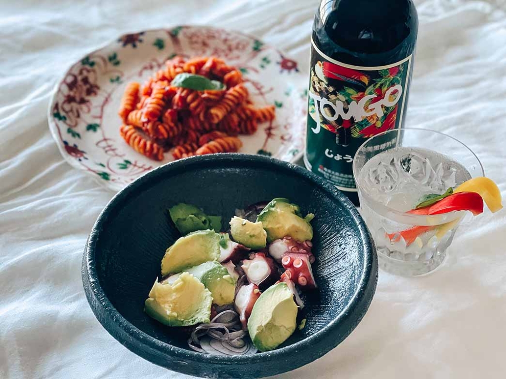 週の半ばの水曜日は、気合を入れすぎない、手早い料理がいちばん。トマトソースは瓶詰めを使って時短! パスタをちょっと変わった形のフジッリにして、バジルを添えれば“いい感じ”に。タコのお刺身だけ、ほんの一手間かけてセビーチェ仕立てにしてあげて、イタリアンの食卓になりました。ついでに焼酎にもカラフルな彩りを添えて……おいしい! 水割りにした〈じょうご〉に、赤や黄色のパプリカとバジルを添えるだけですが、まろやかだけどキレのある焼酎の味わいに、氷で冷えたパプリカの優しい甘みがじわっと染み出します。焼酎にも料理にも使ったバジルが橋渡しになって、一体感のある食卓になるんです。