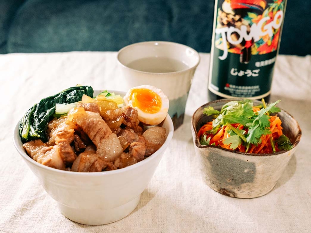 ビールと合わせて食べるイメージの強いエスニック料理。「焼酎って合うの?」 って思いました? すっごく合うんですよ! アジア料理に使われるナンプラーやニンニクのパンチのある味は、特にソーダ割りとの相性が最高。〈じょうご〉のソーダ割りは、焼酎のまろやかでフルーティーな香りがより際立つので、相当いいです。スーパーなどでもエスニックの食材がずいぶん一般的になってきたし、タイ料理の定番・パッタイも家でチャレンジしやすくなりましたよね。豚肉のナンプラー煮込みには、焼酎と黒糖を使って〈じょうご〉と味をリンクさせました。今週もあとひと息。ちょっと気分の変わる食卓で気分を盛り上げます!