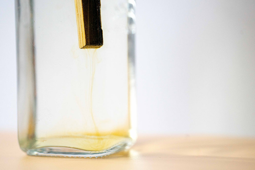 樽スティックを漬けて30分もすれば、ほんのりと黄金色に。色が出るスピードは〈朝日〉×ミズナラが一番早く、次が〈青鹿毛〉×アメリカンホワイトオーク。樽スティックの香りはどれもまだ出ておらず、焼酎本来の香りしか感じられません。