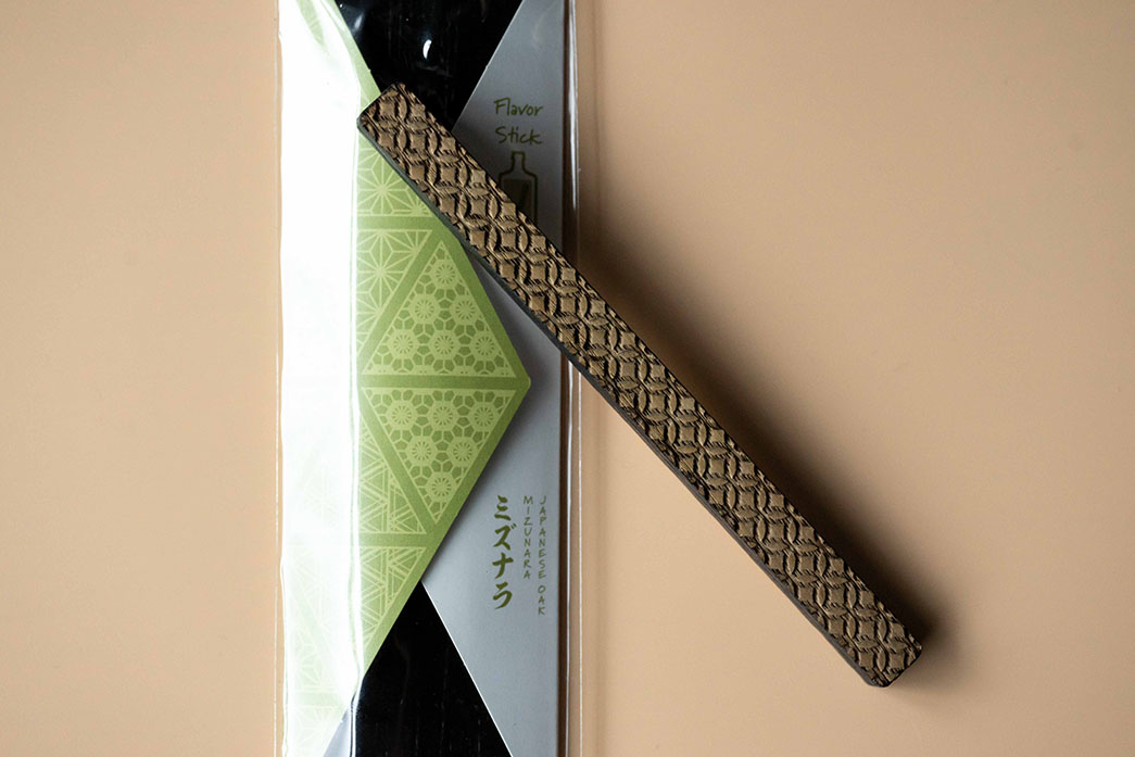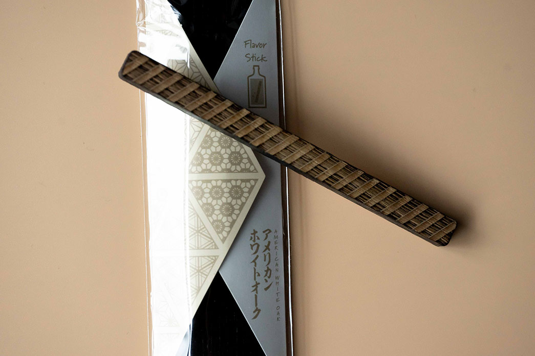 樽スティックは、洋酒を寝かせる樽の材料として使われるミズナラやホワイトオークなどの木材をスティック状に加工したもの。樽同様にチャーリング(焼きつけ)しているため、瓶の中に2週間ほど漬けるだけでしっかりと木の香りがお酒に移り、樽熟成の効果が得られるんだとか!