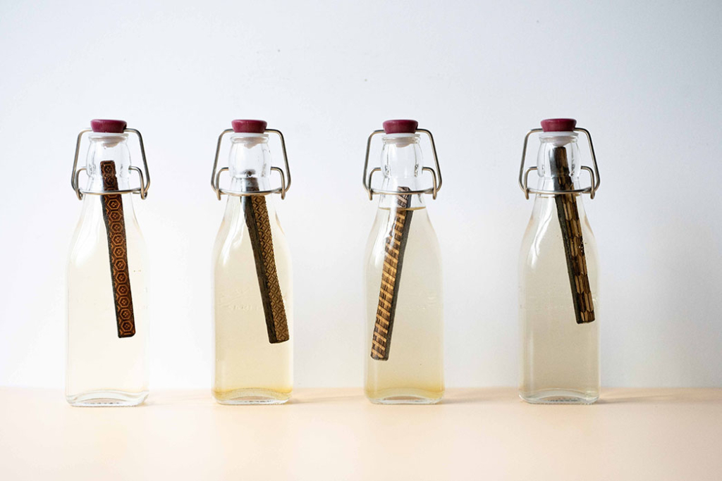 瓶4本にそれぞれ樽スティックを入れ、スティック全体が浸かるまで焼酎・泡盛を注いだら熟成開始。ちなみにどれも樽熟成していない銘柄なので、樽スティックを入れる前の色は無色透明(〈青鹿毛〉は少し白濁)です。