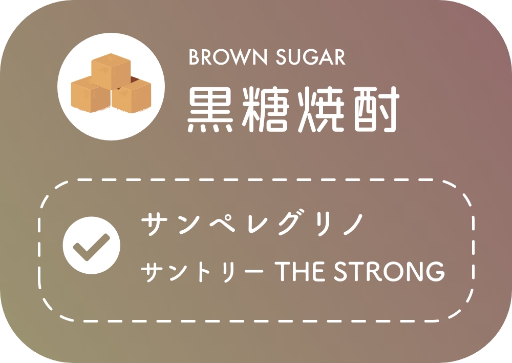 黒糖焼酎に合うのは、ずばり〈サンペレグリノ〉と〈THE STRONG 天然水スパークリング〉の2つ。〈サンペレグリノ〉は、ミネラル感との相乗効果によって爽やかな香りがしっかりと引き立ちます。黒糖の風味が全面に出るバランスの取れた味わいで、ファーストフードから優しい味付けの和食までジャンルを問わず楽しめそうです。〈THE STRONG 天然水スパークリング〉は、とにかく黒糖の香りがよく引き立つ味わいに。炭酸の苦味も加わって、濃厚なハイボールに仕上がります。