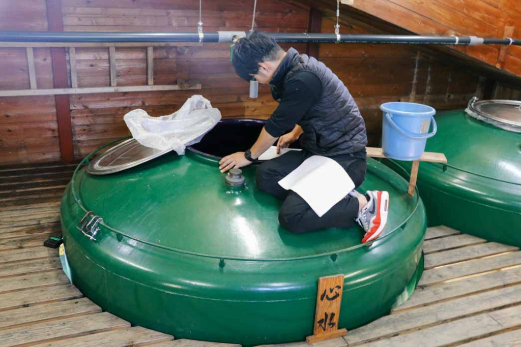 But this storage phase is not simply a matter of letting the distillate sit in the tank. Brewers carefully monitor the condition of the distillate, thinking ahead to its state at the time of shipment. Depending on its condition, they may stir it with a large paddle called a kai-bō, or filter it to adjust its flavor.