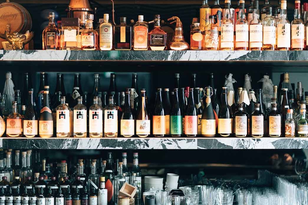 The back bar at Ginza’s MIXOLOGY SPIRITS BANG(K), lined with an array of shochu bottles.