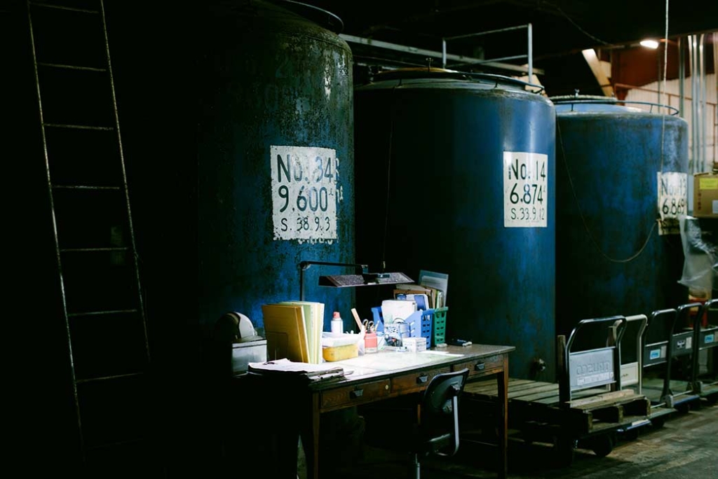 ウイスキーの熟成と同様に、さまざまな木樽に貯蔵して熟成を行う樽熟成。ウイスキーやシェリー酒などの熟成に用いられたオーク樽を再利用したり、いろんな樹種の新樽を利用したりと、樽の素材自体もバリエーションが豊富です。樽自体がもつ香りが焼酎に移ることで、複雑で独特の風味が生まれます。さらに、樽からは木の色素も溶け出すため、焼酎はうっすらと琥珀色になっていきます。現在は光量規制により、焼酎の色の濃さが制限されているため、色の調整の必要があります。